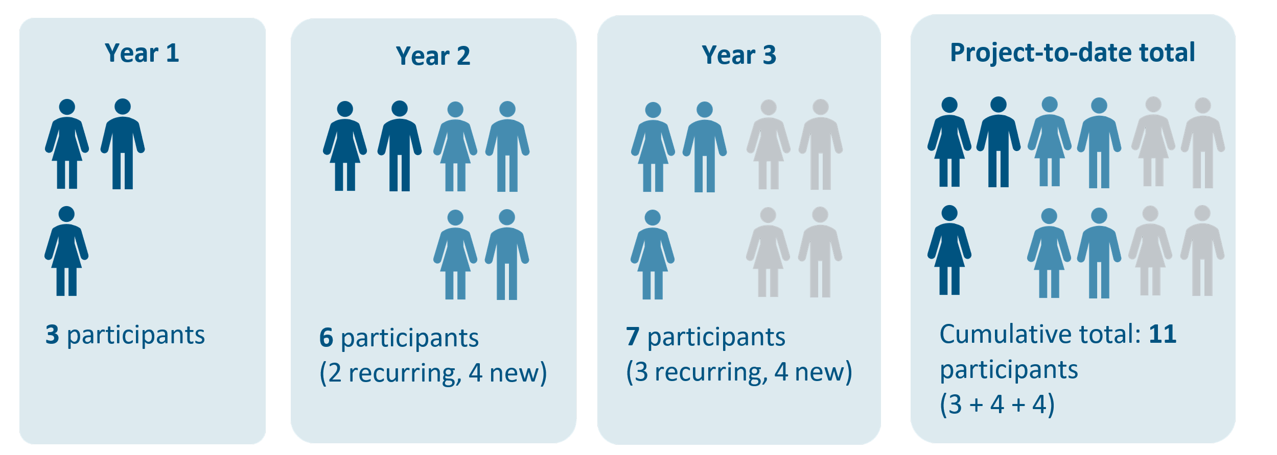 For multi-year projects, persons who participate or receive support in multiple years should be counted in each relevant year. However, to avoid double-counting, the project-to-date total must be adjusted accordingly. The project-to-date total can be therefore accumulated over the years. See below for an example